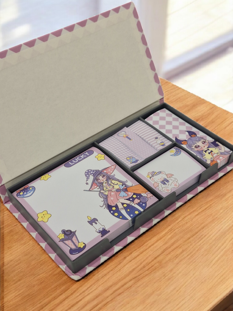 طقم ملاحظات بتصميم كرتوني لطيف وألوان هادئة، يحتوي على عدة أوراق ولاصقات بأحجام مختلفة داخل علبة أنيقة ومنظمة، الرسومات ناعمة وجذابة تضيف لمسة جمالية للمكتب أو الحقيبة، مصنوع من ورق جيد الاستخدام اليومي للتدوين والتذكير، حجمه العملي يجعله مثاليًا للاستخدام المدرسي أو المكتبي وكقطعة لطيفة للإهداء
