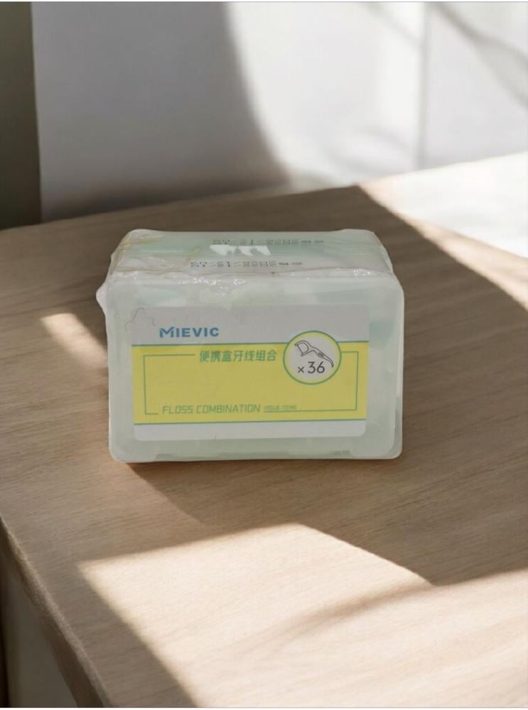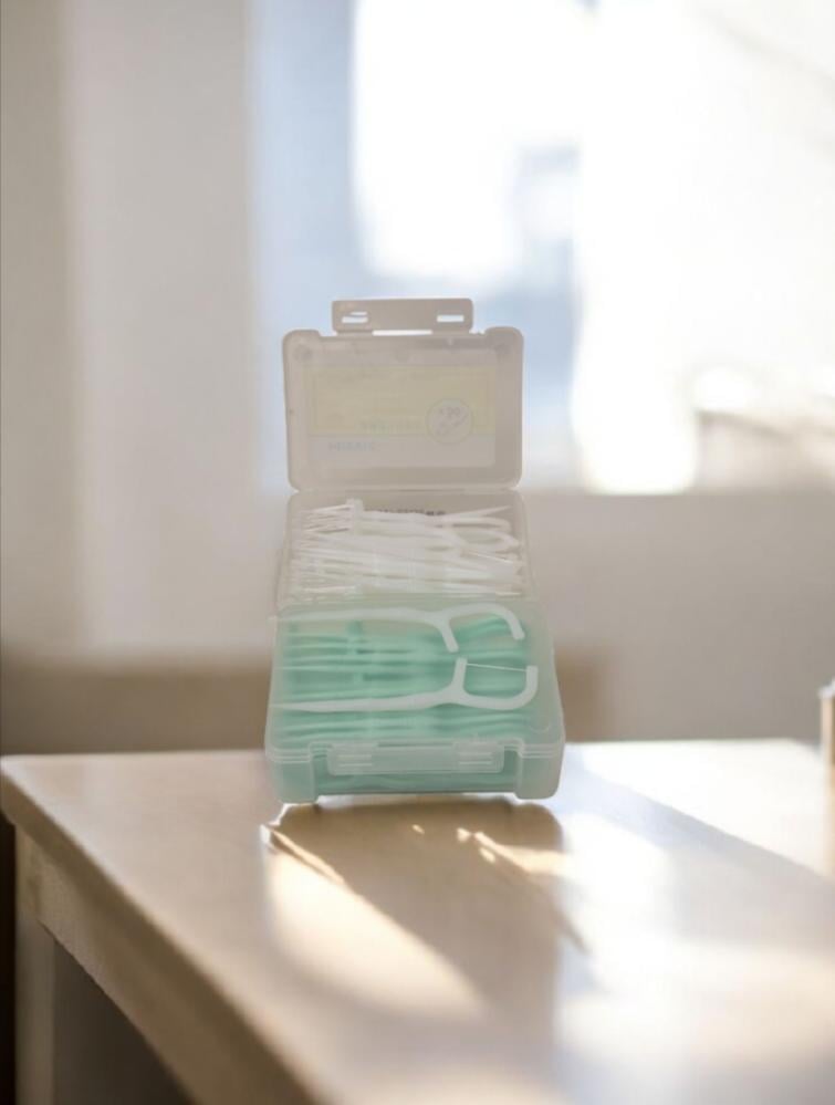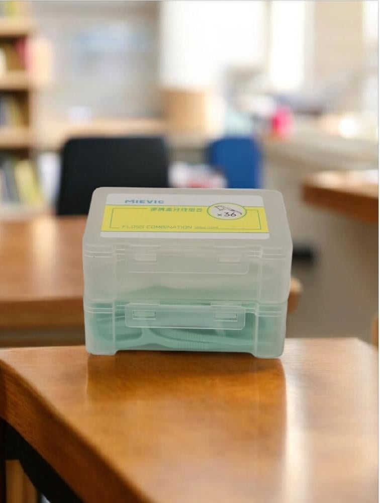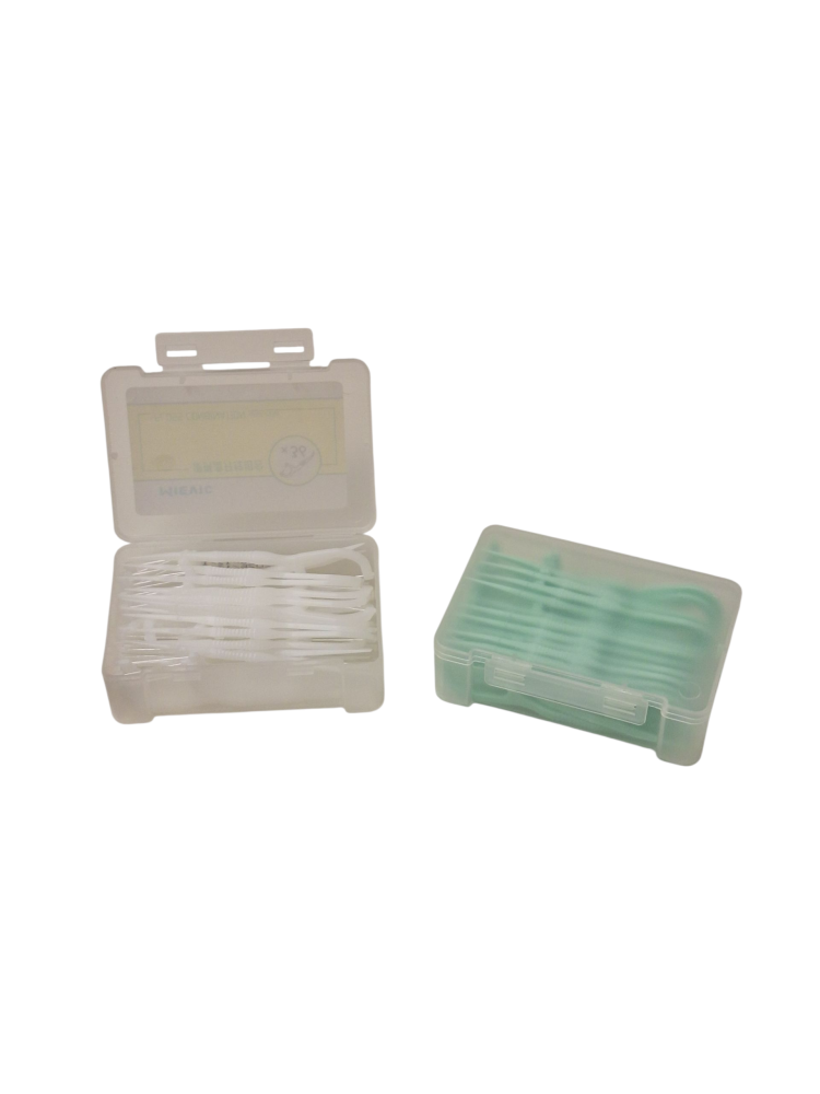 عبوة بلاستيكية تحتوي على خيوط تنظيف أسنان مصممة بشكل عملي على شكل قوس. هي مثالية للحفاظ على نظافة الأسنان وإزالة بقايا الطعام من بينها بكل سهولة.