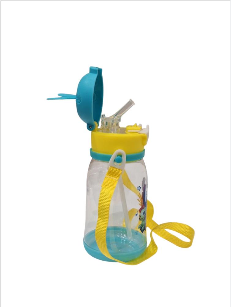 زجاجة مياه بلاستيكية بتصميم مميز ومرح، مزينة برسومات شخصيات كرتونية محببة. تحتوي على غطاء آمن مع ماصة مدمجة، مما يجعلها مثالية للاستخدام اليومي للأطفال في المدرسة أو أثناء التنقل. إنها خيار عملي وجذاب، يساعد على تشجيع الأطفال على شرب الماء.