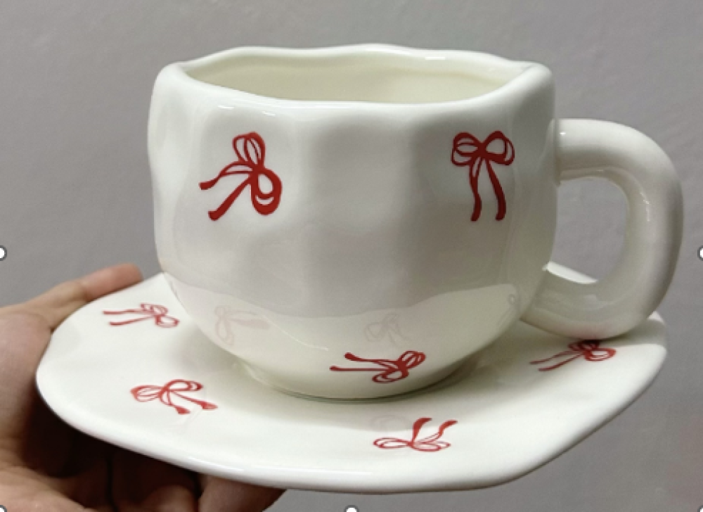 كوب وصحن فيونكات حمراء300مل