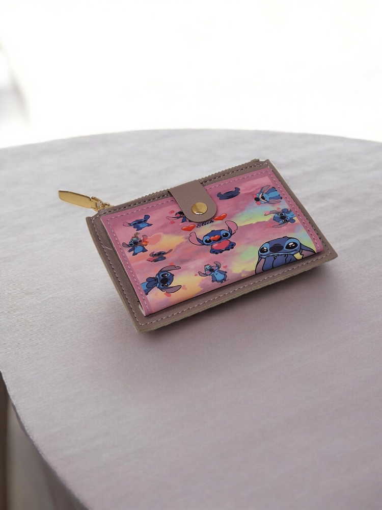 محفظة صغيرة وأنيقة تتميز بتصميمها المتعدد الألوان والمزينة برسومات كرتونية لطيفة لشخصية ستيتش. تحتوي على سحاب للإغلاق وحجرة شفافة لبطاقة الهوية، بالإضافة إلى زر كبس علوي للمزيد من الأمان. إنها مثالية لحمل النقود والبطاقات الأساسية، وتُعد إكسسواراً عملياً وجذاباً.