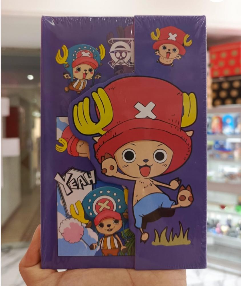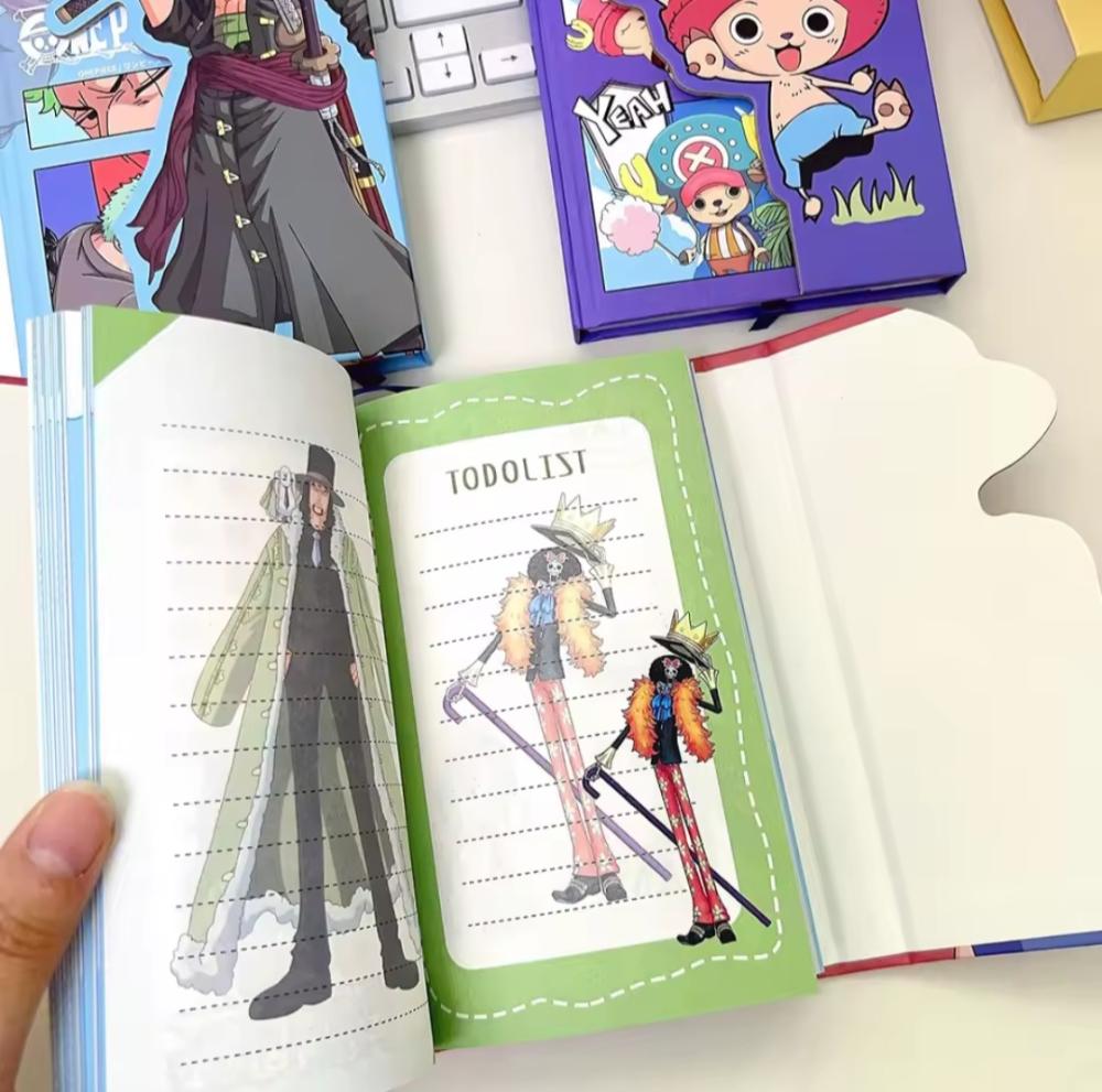دفتر ملاحظات جذاب، مزين بتصميمات شخصيات من مسلسل ون بيس شهير. يحتوي على صفحة غلاف مزخرفة وشخصية بارزة، مما يجعله قطعة فريدة ومميزة. إنه مثالي لمحبي القصص الخيالية، ويشجع على تدوين الأفكار والمغامرات.